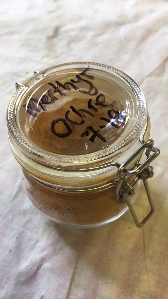 this rich golden ochre powder is collected by me as i pedal the mountains above the historic industrial revolution town of merthyr in South Wales. It’s found in the mountains, where locals took the waters for cures and the mineral pigments were sold across the world. cat hand grinds it in a pestle and mortar and then it's packed in a cork stopped 10g glass vial.